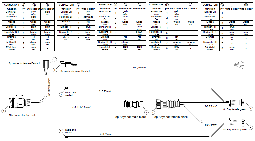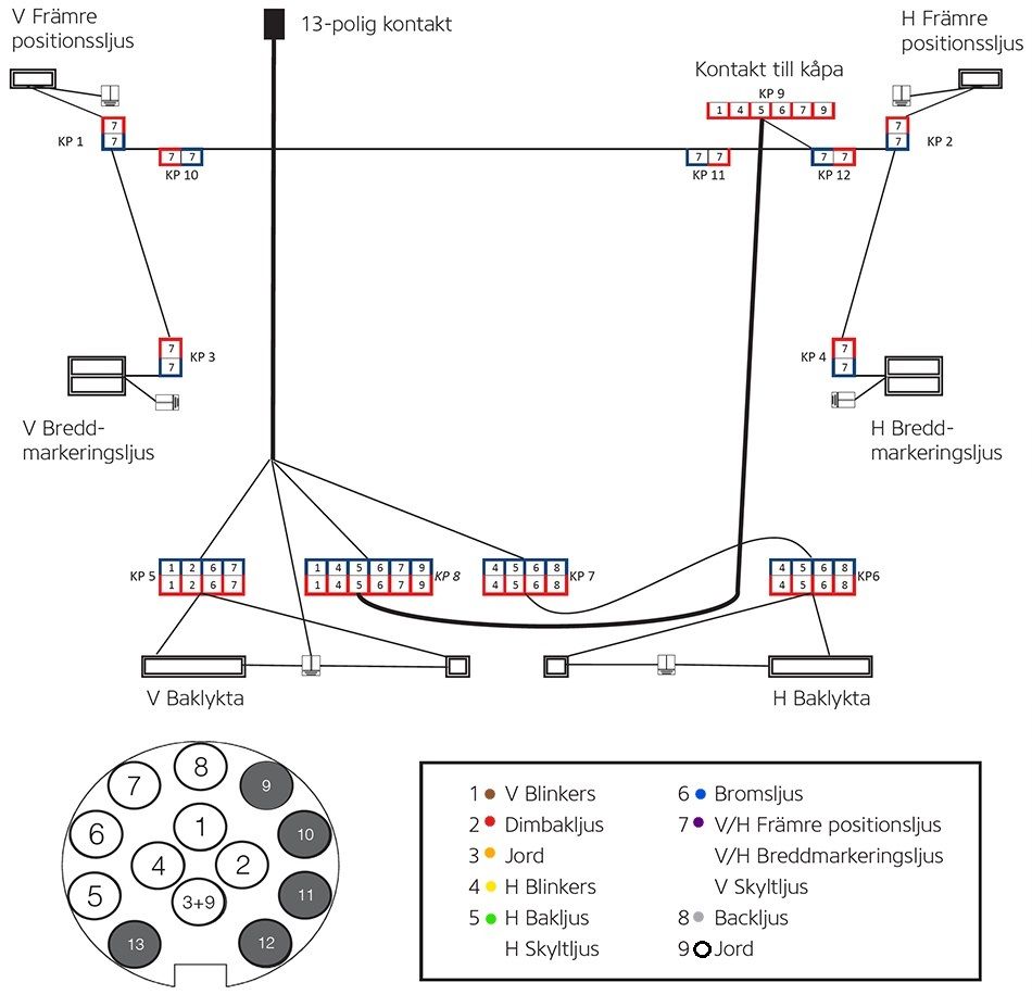 Släpvagnarna ur 4P Trailers modellprogram är utrustade och typgodkända med 13-polig elkontakt för den elektriska kopplingen mellan dragbil och släp. Är bilen är utrustad med 7-polig elkontakt krävs en adapter.